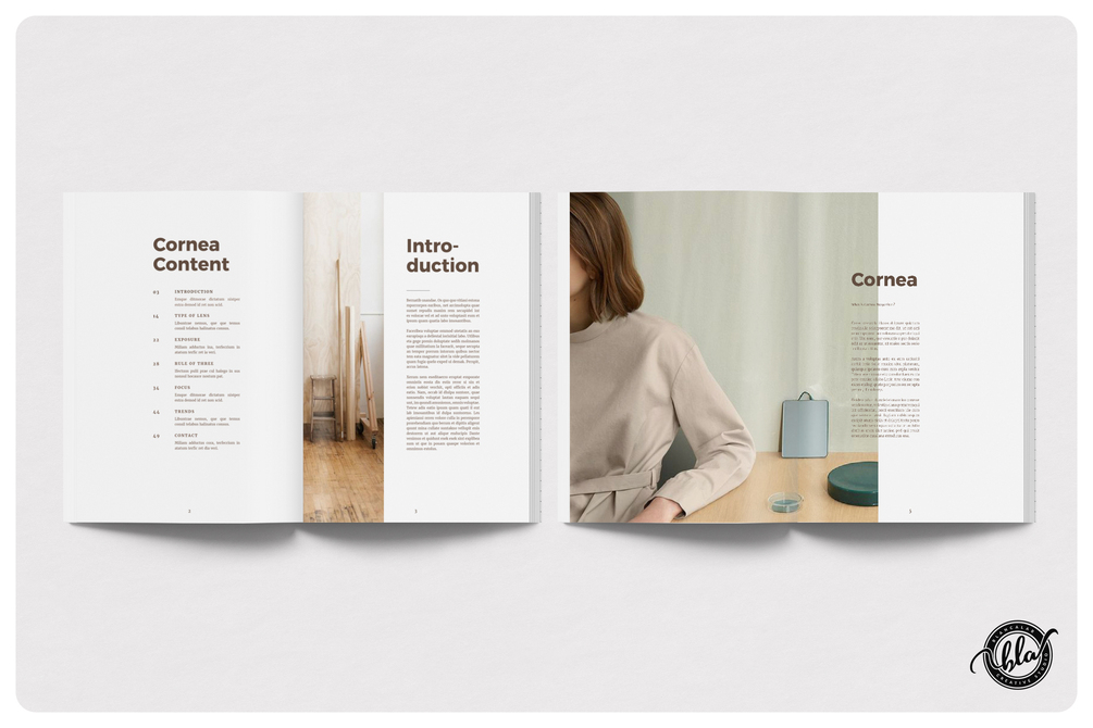 Cornea is a Photography Portfolio layout and also can be a magazine layout with layered imagery, bold graphic elements and flashes of color. The layouts are minimal, beautifully spaced, and elegant.